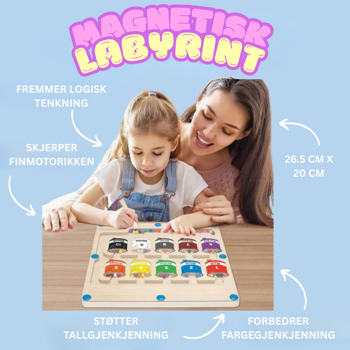Med 55 magnetiske perler i 10 livlige farger bruker barna den magnetiske staven til å lede hver perle inn i den matchende boksen. Denne engasjerende aktiviteten styrker hånd-øye-koordinasjonen, finmotorikken og logisk tenkning. Hver bevegelse er et lekent skritt mot læring.